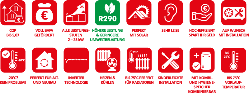 Ideal für Altbau: Vorlauftemperatur bis 75°C. Damit ist die Beheizung mit Radiatoren möglich. Dazu bieten wir Hohe Leistungsklassen an bis 25 kW.